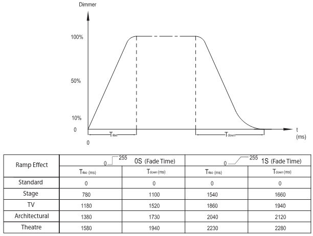 Dieser Kanal steuert sog. Dimmerkurven [0-20] Standart [21-40] Bühne [41-60] TV [61-80] Architektur [81-100] Theater [101-255] Aktueller, an der Lampe eingesteller Modus |